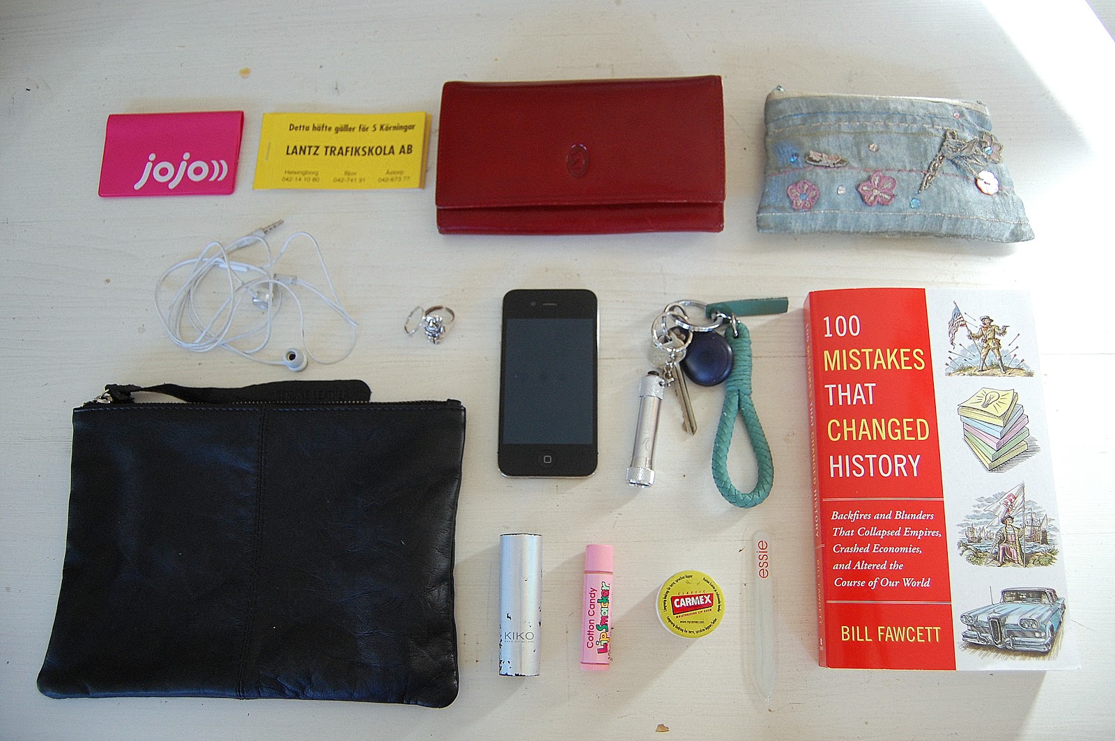 Lip balm / Lipstick: Winter in Sweden can get freezing, it is already starting to happen and once it gets cold, the easier chapped lips appear. So I trust my carmex lip balm for healing (it is perfect!) and my cotton candy lip smacker which is pretty much only there because it smells so scrumptious. I also carry my favorite lipstick with me which is a Spanish brand Kiko.